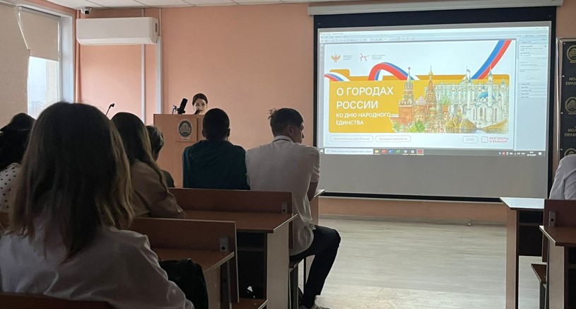 20 октября 2025 в АНО ПО «Колледж правосудия» состоялось очередное занятие из цикла «Разговоры о важном», посвящённое теме «О городах России. Ко Дню народного единства». Урок призван объединить школьников и студентов от Калининграда до Владивостока в путешествии по разным уголкам страны — от древних городов до современных мегаполисов. Современные тенденции развития российских городов поднимают вопросы комфортности городской среды и многообразия их этнического состава. На занятии обсудили, как города России отражают её богатую историю и культуру, а так же узнали о том, что делает нашу страну уникальной.